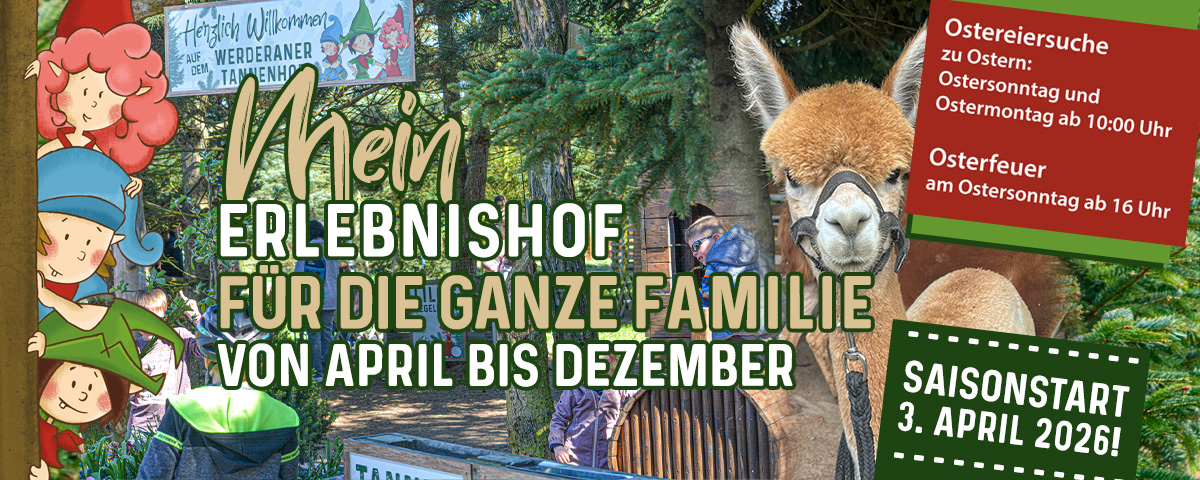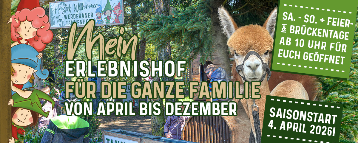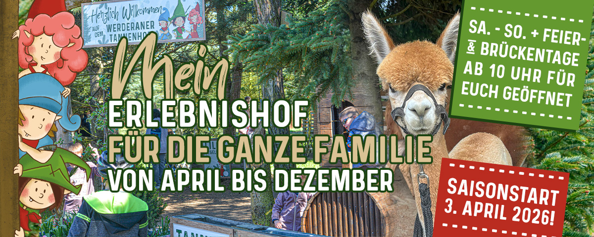 Die havelländische Blütenstadt Werder ist die Heimat des Werderaner Tannenhofs – einem Ort, an dem Naturerlebnis, Erholung und saisonale Traditionen aufeinander treffen. Entdeckt unsere weitläufige Tannenplantage und Tiere, genießt entspannte Stunden im Grünen und lasst euch von einzigartigen Veranstaltungen und unserem vielfältigen Angebot inspirieren.